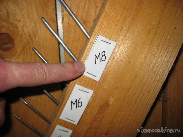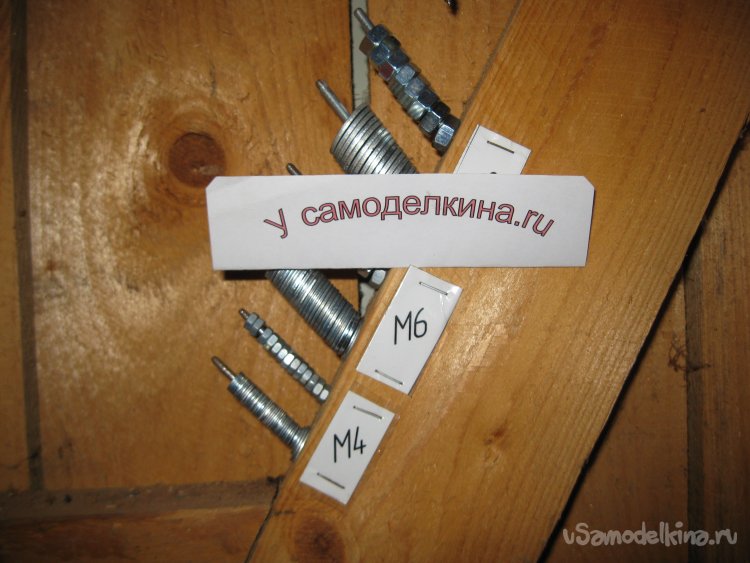 Ну, а затем напечатал на принтере бирки с обозначениями размеров гаек, оклеил их прозрачным скотчем и при помощи строительного степлера, прикрепил к балке, под соответствующими гвоздями.