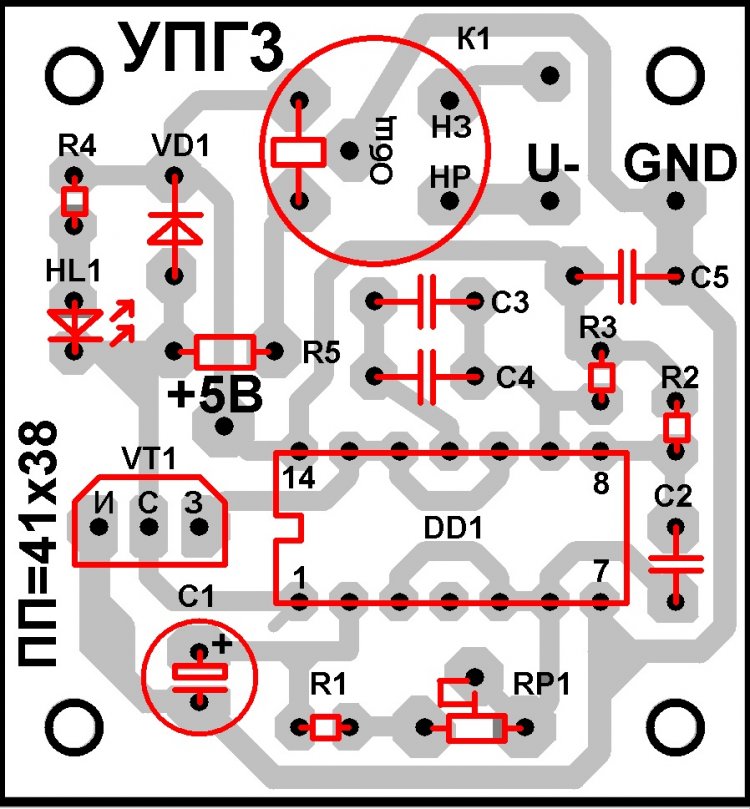 Схема расположения деталей УПГ3 на печатной плате, выполненной для ДСПС.