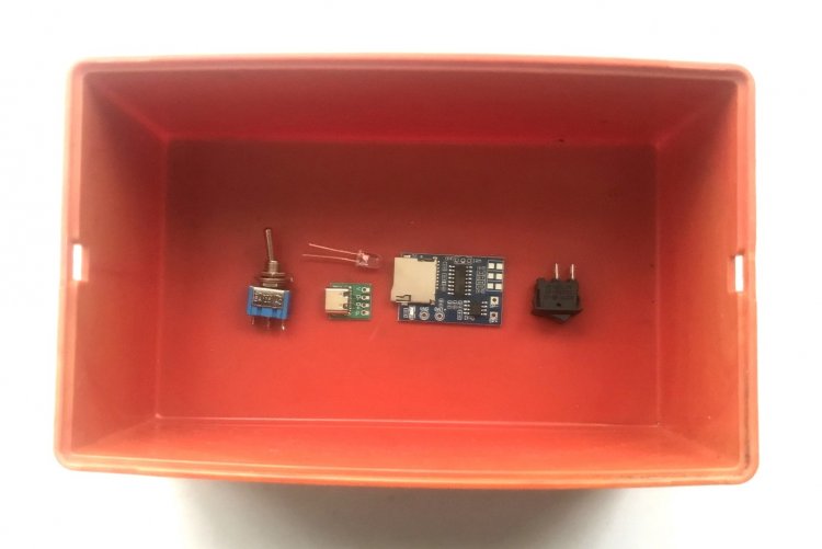 Слева – направо: 1). SA1 типа MTS-103. 2). LED HL1. 3). Разъём питания «Адаптер USB Type-C гнездо». 4). модуль MP3-01-PCB (собственно плеер). 5). Клавишный «Выключатель KCD11 черная клавиша».