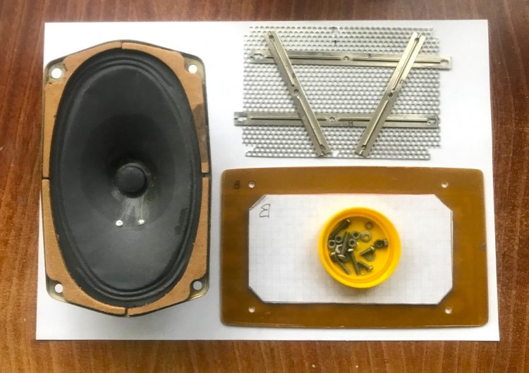 По часовой стрелке: 1) Динамик 1ГД-40. 2). Дюралевая защитная сетка от повреждения диффузора BA1. 3). Никелированные «штапики» для окантовки защитной сетки. 4). Передняя стенка корпуса из 2-х мм стеклотекстолита с 8-угольным пазом под динамик. 5). Крепёж М3 для динамика BA1.