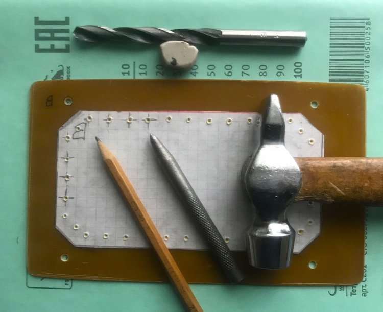 Для ускоренной разметки центров отверстий (при отсутствии штангенциркуля) на стеклотекстолит наклеивается листок из школьной тетради в клеточку. Каждая клеточка = 5х5 мм. Шаг между центрами отверстий = 10 мм. Диаметр сверла = 8 мм.