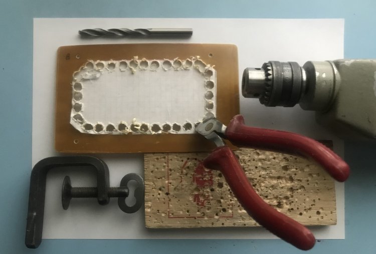 Выкусывание кусачками высверленного (но пока не выпадающего) паза под динамик. Струбцина использовалась для зажатия стеклотекстолитовой заготовки на рабочем столе при сверлении отверстий.