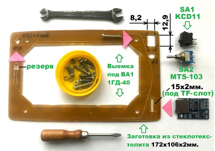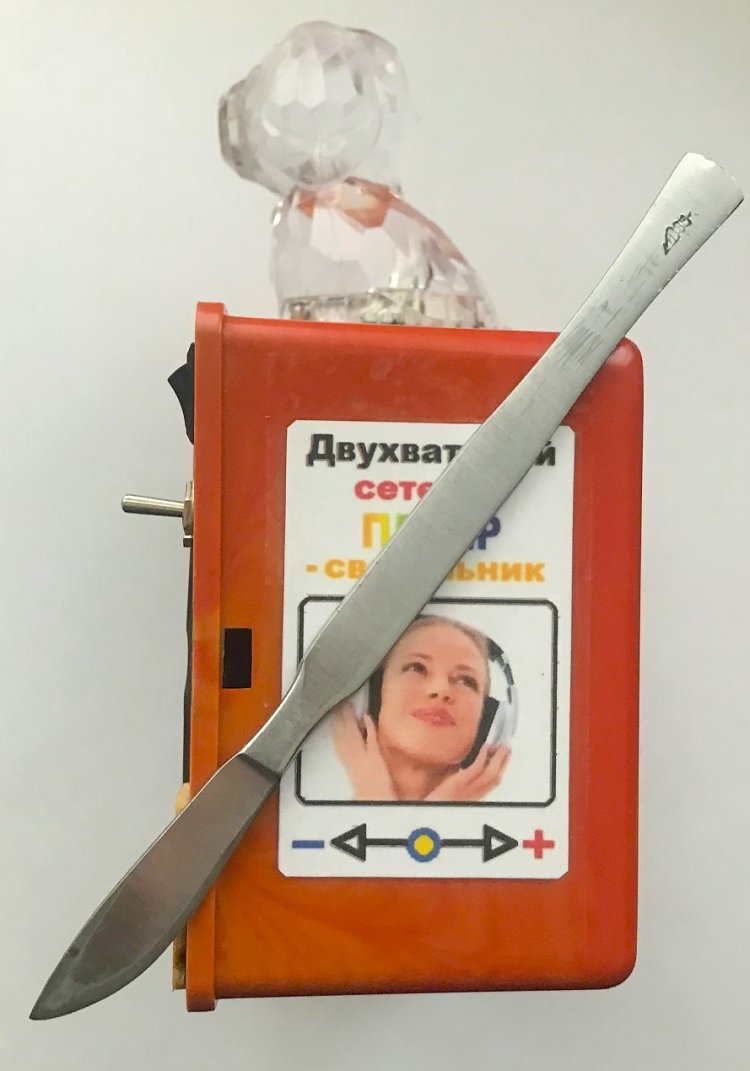 Чтобы динамик полностью поместился в выбранном корпусе, передней стенке корпуса придана форма слегка скруглённого прямоугольника. Для надёжного закрепления SA1 в выпиленном пазе, следует строго выдержать указанные размеры паза 12,9 х 8,2 мм. Чистовая доводка паза выполняется надфилем прямоугольной формы. LED «резерв» в ДСПС не использован. В отверстие диаметром 4,8 мм можно установить HL1, если фигурка собачки для светильника не приобретена.