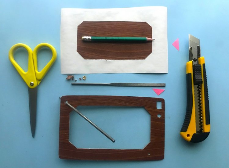 Излишки текстурной плёнки удаляются однонаправленными движениями плоского надфиля или напильника с мелкой насечкой. Ножницы выполнить данную операцию столь же аккуратно не смогут. Заклеенные отверстия протыкаются круглым надфилем также однонаправленными движениями (сверху-вниз). Должно получиться аккуратно! Оставшийся кусочек плёнки не выбрасываем, а оставляем «про запас».