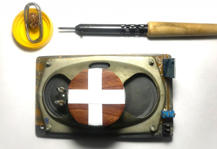 В правом нижнем углу в паз размером 12,9х8,2 мм туго (на трении) до упора вставлен «клавишник» SA2. Обратите внимание на горизонтальное крепление SA2. Всё готово. Остаётся выполнить пайку. «Декоративное» оформление динамика скрывает следы коррозии на его постоянном магните.