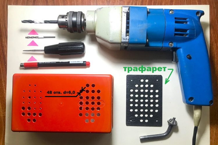 Для получения точного взаимного расположения просверленных отверстий рекомендуется предварительное сверление отверстий сверлом малого диаметра (1,6 … 2,9 мм). Если нет трафарета, то разметку можно выполнить с помощью приклеивания тетрадного листка «в клеточку» (см. рисунки 04 и 05).