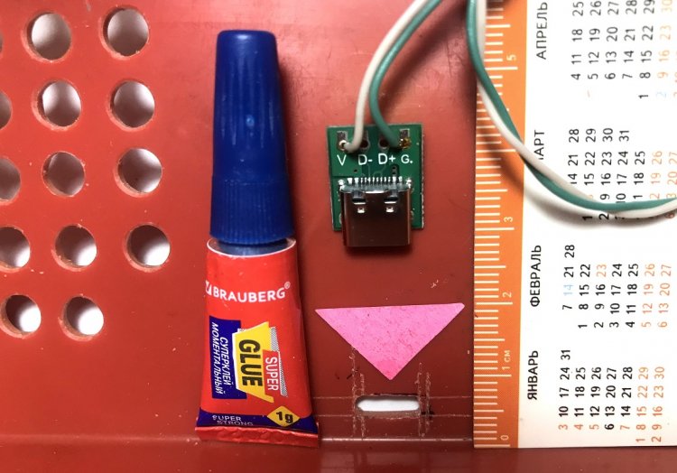 Гнездо питания «+5 Вольт» («Адаптер USB Type-C гнездо») с уже припаянными проводниками вклеивается в паз, пропиленный на задней стенке корпуса, с помощь суперклея SUPER GLUE. Буквой «G» на плате обозначено место для общего провода (GND), имеющего полярность «минус». Буквой «V» на плате обозначено место для провода «+5 Вольт». Средние площадки («D-» и «D+») не используются.