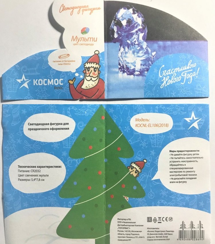 Фигурка собачки для светильника взята готовой (см. фото её упаковки на рисунке 12). Из неё вынуты «севшая» батарейка CR2032 и атрибуты крепления батарейки и светодиода. Последовательно с выводом «-» светодиода (HL1) припаивается резистор R1 620 Ом.