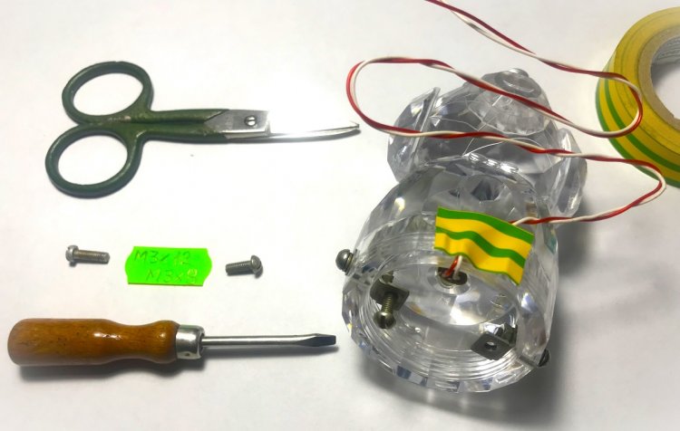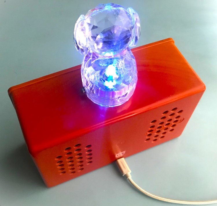 В схеме ДСПС можно применить резистор R1 типа ОМЛТ, С2-23, С2 - 33 или ему подобные с разбросом номиналов до ± 20 % и мощностью рассеивания 0,25 Вт. Резистор R2 – низкоомный типа ОМЛТ, МЛТ, МТ, С2-26, С2-33 с мощностью рассеивания 0,25 … 1 Вт. Светодиод HL1 (D = 5,1 мм.) RGBYW0 - 7 цветов (3,0 … 3,4 В; 20 мА) может быть заменён аналогичным светодиодом, взятым из светодиодной фигурки собачки «Мультицвет» производства КНР (см. рисунок 12). Головка динамическая BA1 1ГД-40 может быть заменена современной широкополосной, малогабаритной, желательно мощностью от 2 Вт.