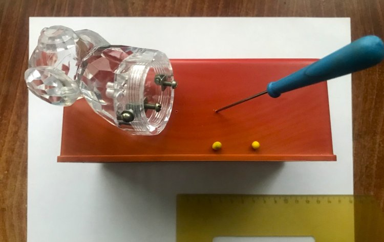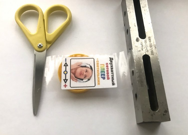 Найти центр для установки прозрачной собачки на верхней стороне красного корпуса можно по линейке, с помощью штангенциркуля и шила. Так как корпус не имеет форму прямоугольника, при разметке может появиться погрешность. Уточнить взаимное расположение центров отверстий можно «методом пластилинового трафарета». Головки обоих винтов М3х8 слегка облепляются маленькими шариками жёлтого пластилина и вместе с собачкой прижимаются к месту на красном корпусе, где должна располагаться собачка. В пластилине, перелепившемся с головок винтов на корпус плеера, хорошо будут видны центры крепёжных отверстий. Их «подтверждают» шилом и, убрав отпечатавшийся пластилин с корпуса, просверливают отверстия (d = 2,9…3,2 мм) под винты М3х8.