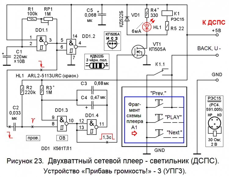 Режимов «Пауза» и «Стоп» в ДСПС нет. Их заменяет выключение клавишного выключателя SA1. Повторное включение начинается с запомненного плеером места и с прежней громкостью.