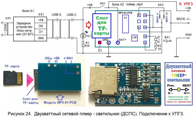 В корпус вклеены: А) разъём питания «Адаптер USB Type-C гнездо». В интернет-магазине MCU он имеет артикул: 02317 и на 25.07.2024 цену 21 рубль. Б) модуль MP3-01-PCB (собственно плеер) производства КНР.