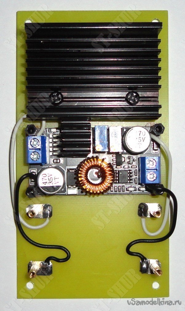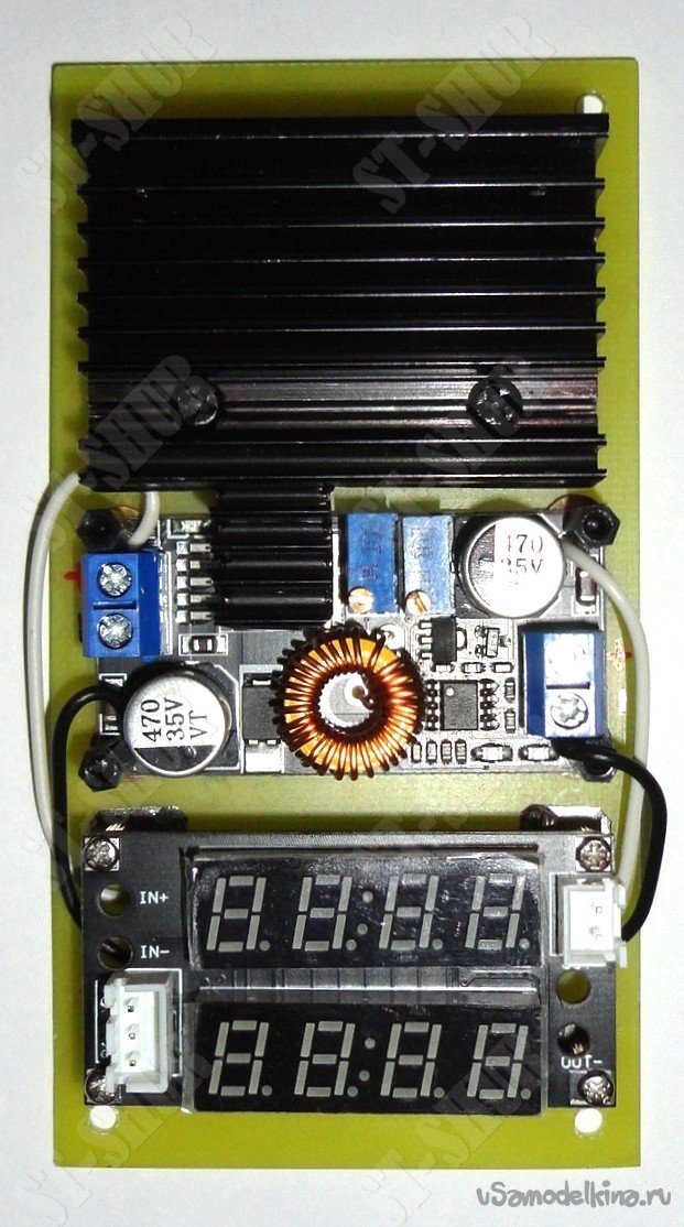 Так как, в силовом модуле имеются отдельные отверстия для пайки проводов, а в модуле вольтамперметра нет, то из обрезков металлической ленты (для сварки АКБ) были вырезаны контактные площадки для латунных стоек. При помощи подбора шайб и стоек для п/п все элементы были закреплены на монтажной платформе. Радиатор установлен с использованием теплопроводной пасты «КПТ-8».
