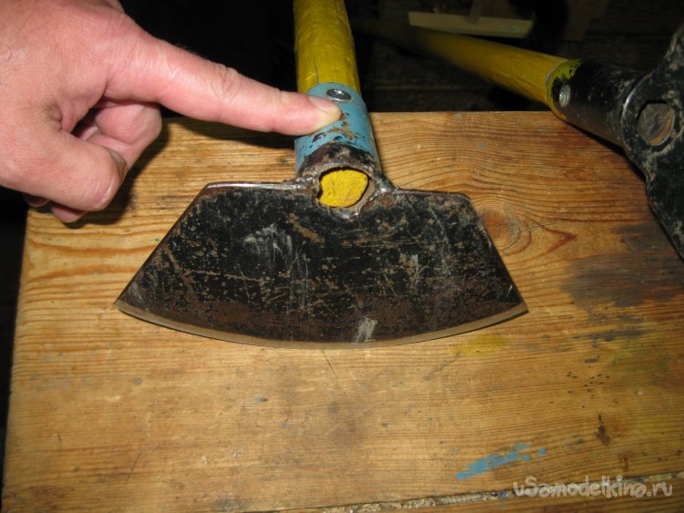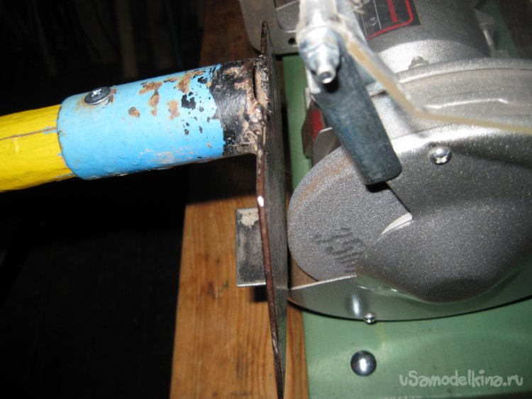 Поэтому, для того, чтобы сделать заточку тяпок с длинными черенками на точильном круге более простой и удобной, я начал применять очень простое приспособление.