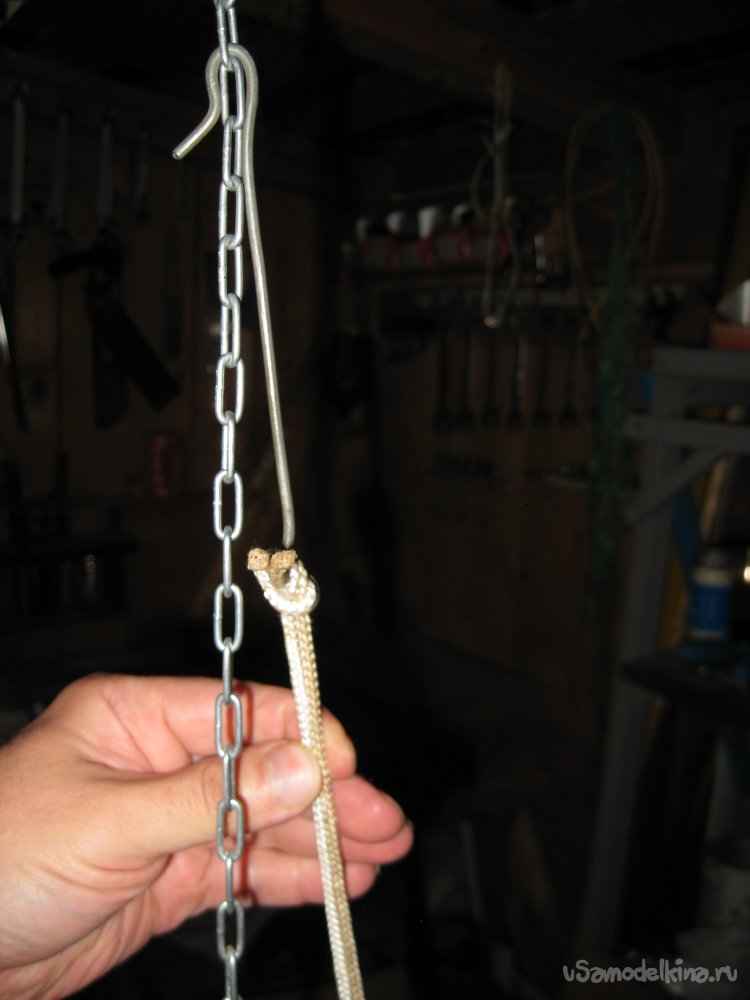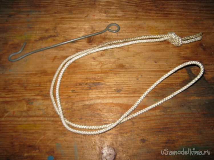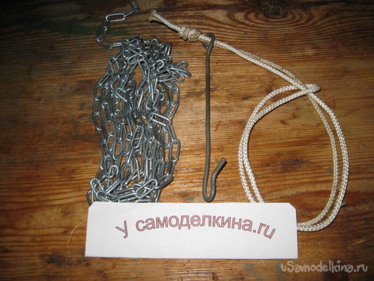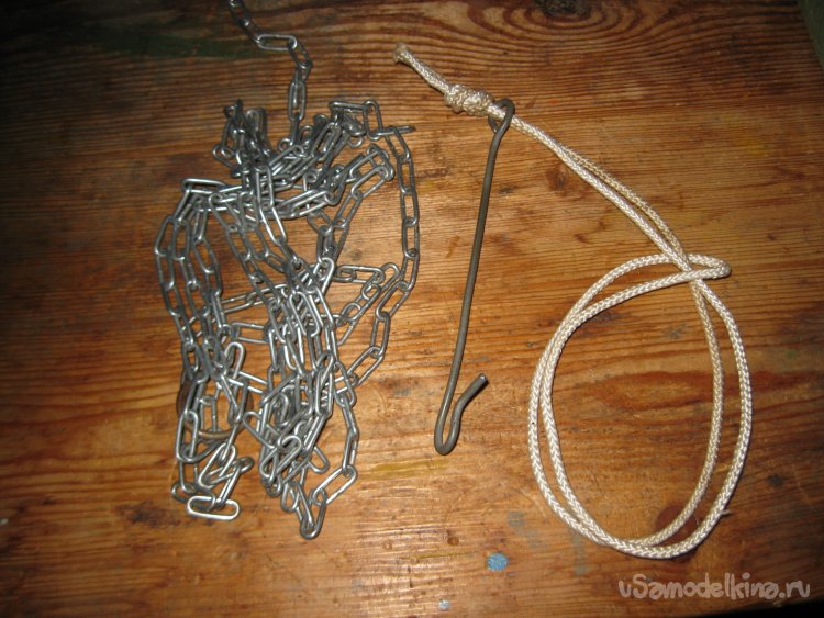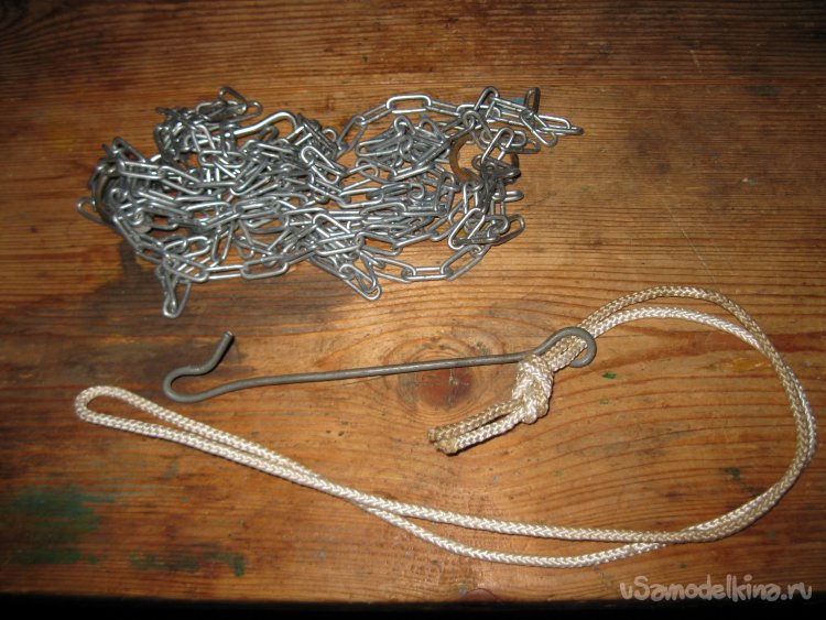 Данное приспособление, состоит всего из трех частей. Это, собственно, прочная длинная цепочка, небольшой отрезок крепкой веревки и крючок из проволоки.