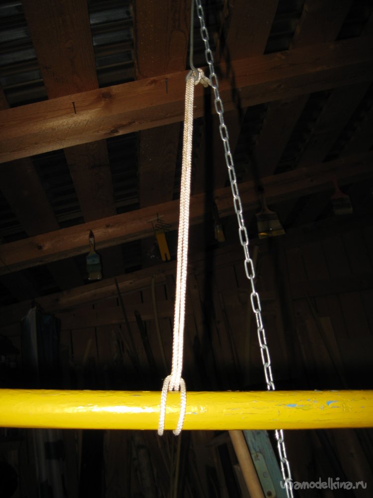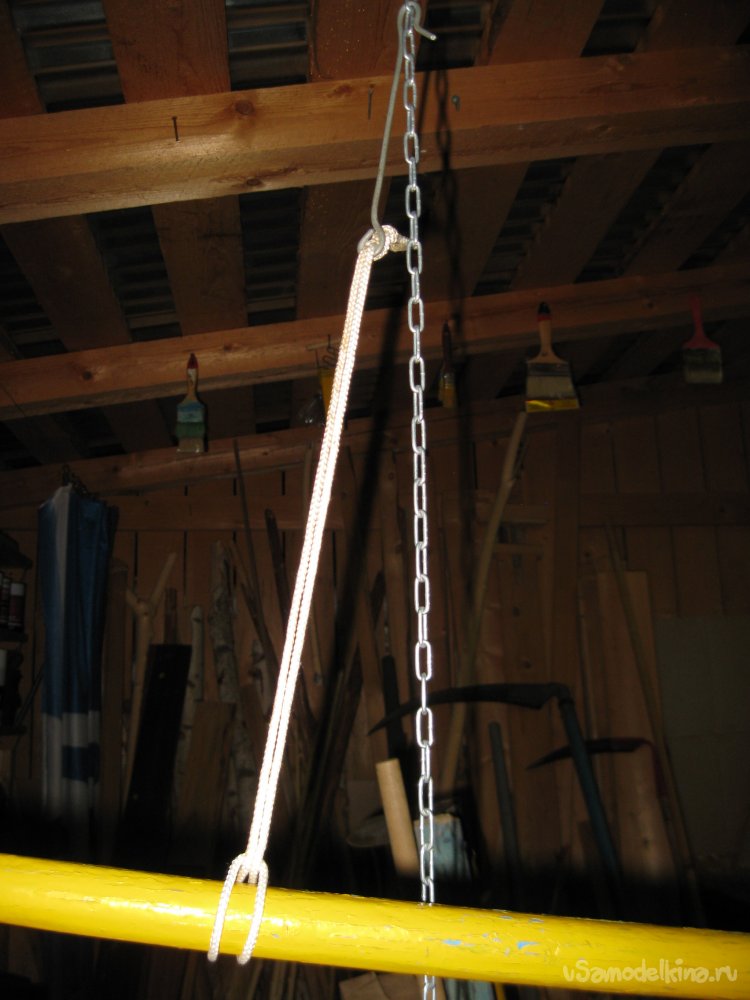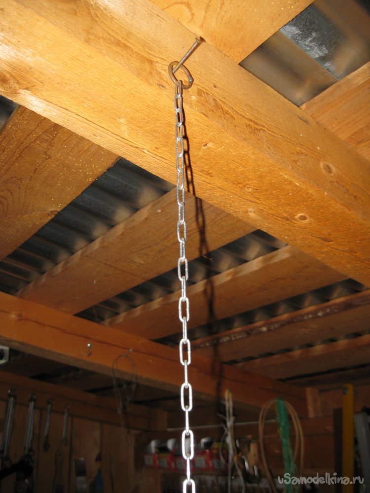 Сначала метрах в полутора позади верстака, на котором у меня стоит точило, я подвешиваю к потолку цепочку.