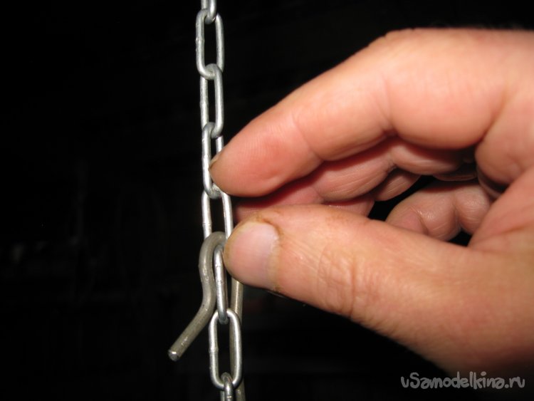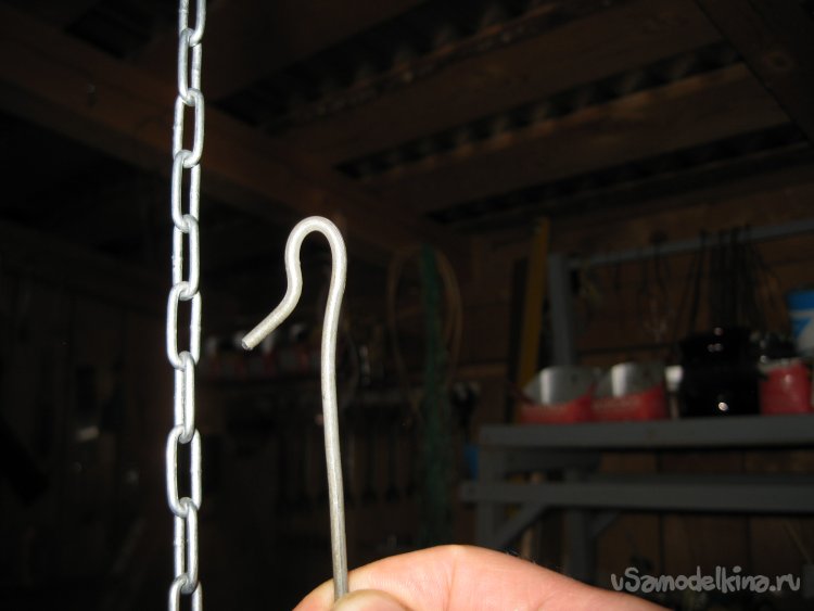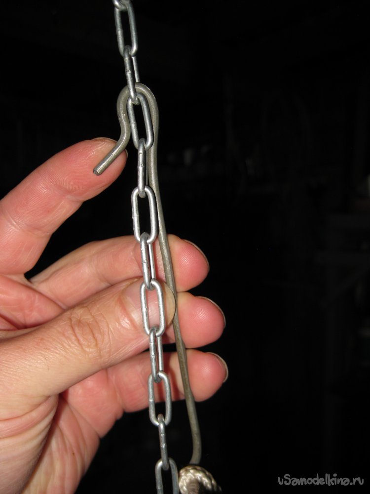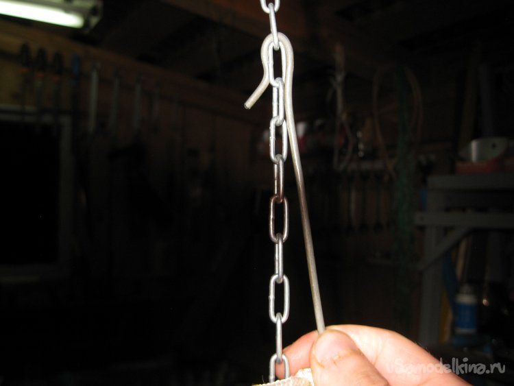 После этого, продеваю крючок в одно из звеньев цепочки и, таким образом, подвешиваю черенок тяпки на цепочке.