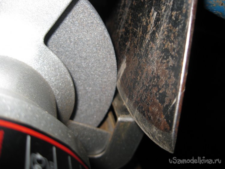 Затем кладу тяпку лезвием на подручник перед точильным кругом (то есть примерно в то положение, при котором лезвие тяпки будет находиться во время заточки), и начинаю выставлять угол заточки.
