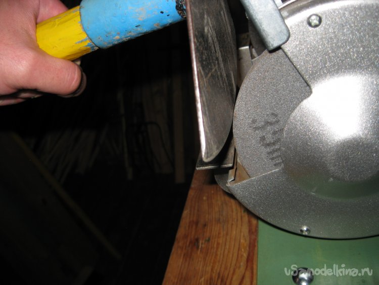 Затем кладу рабочую часть тяпки на верстак перед точилом.