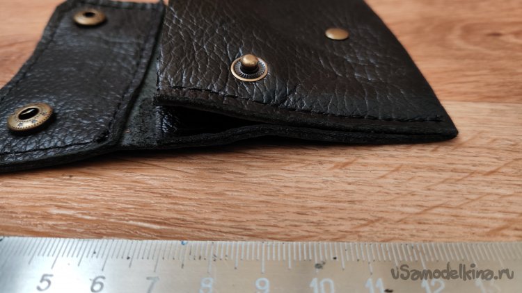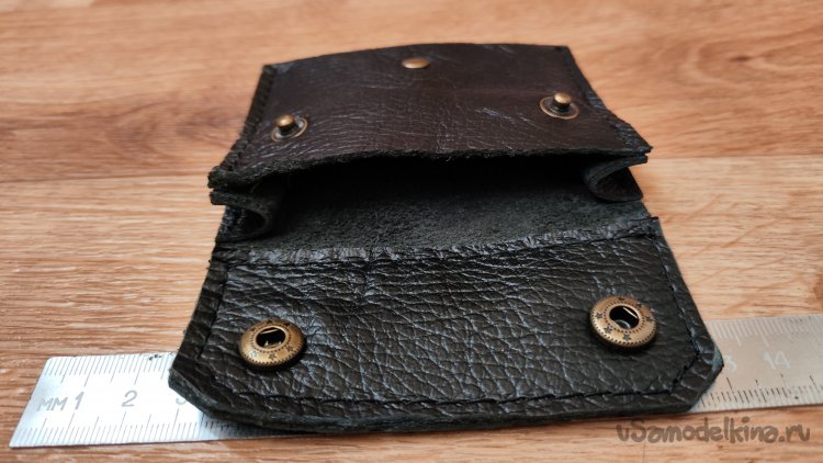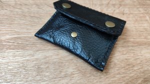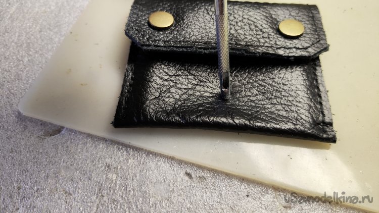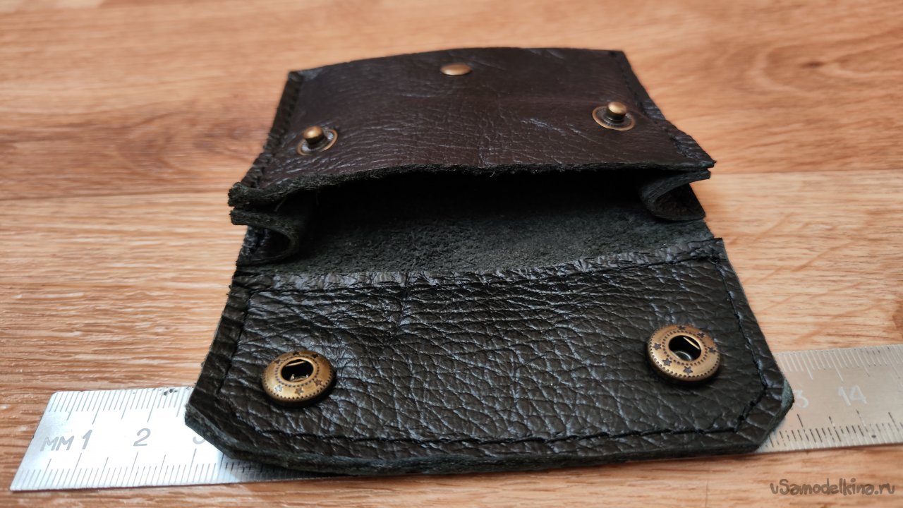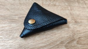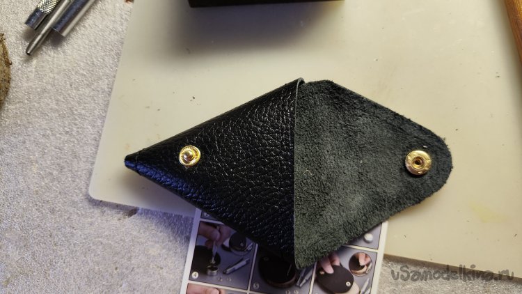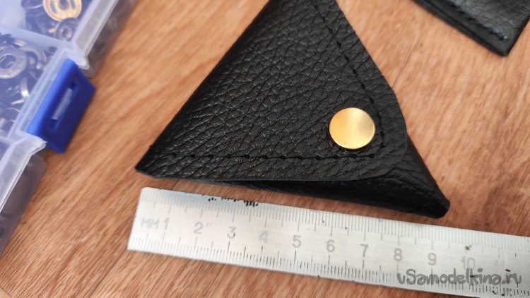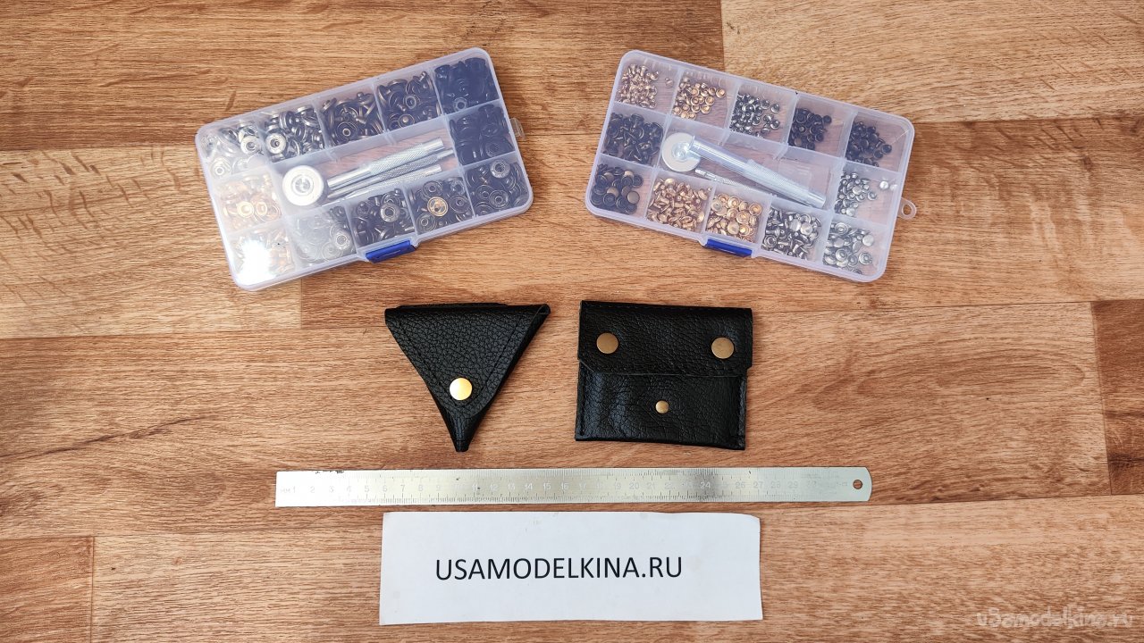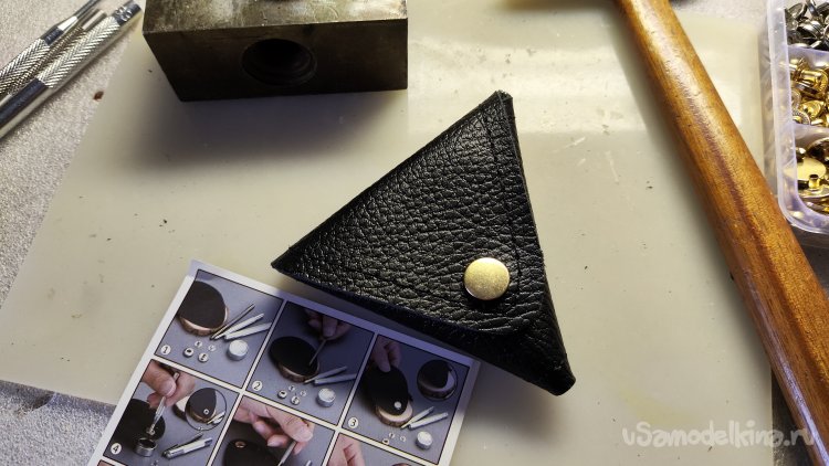Кожа есть, осталось придумать, что из нее сделать. На просторах интернета нашел интересную треугольную модель монетницы. Вырезать её из полосы кожи не составило труда. Отрезал обычным канцелярским ножом, края закруглял ножницами. По краю прошил нитками. На одной модели решил не останавливаться и сделать обычную квадратную монетницу с клапаном. Замок применять не стал, хочу поставить кнопки. Заодно купил заклёпки или как их ещё называют хольнитены.