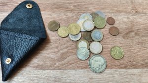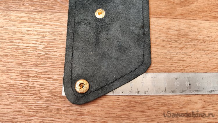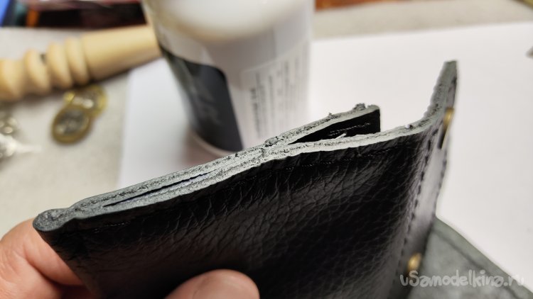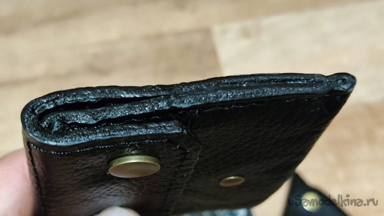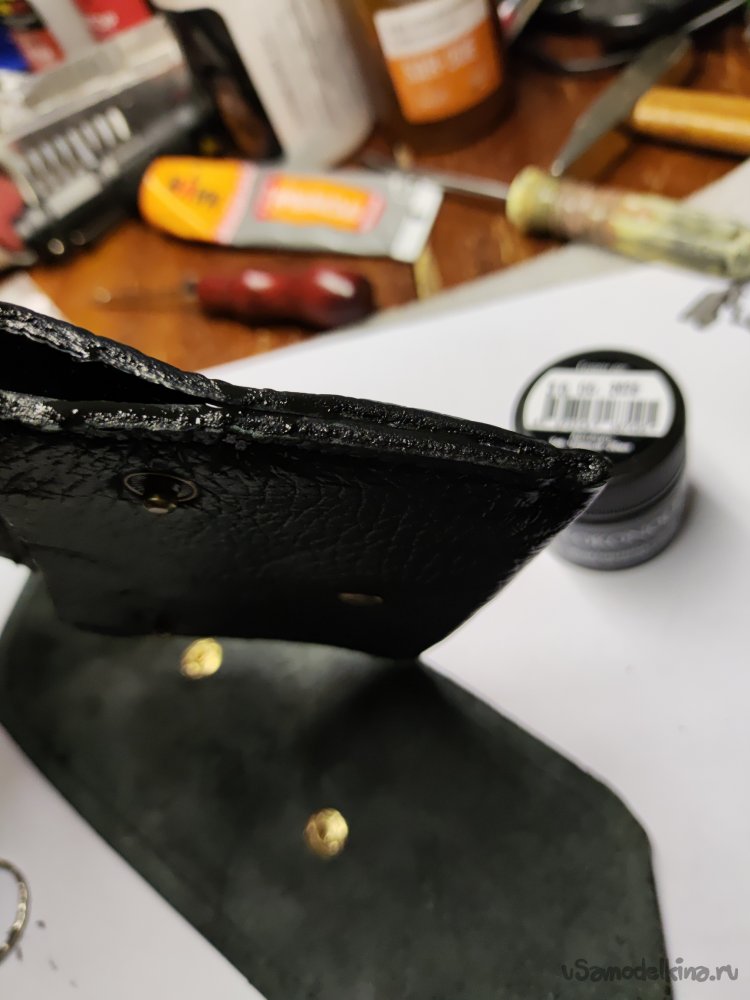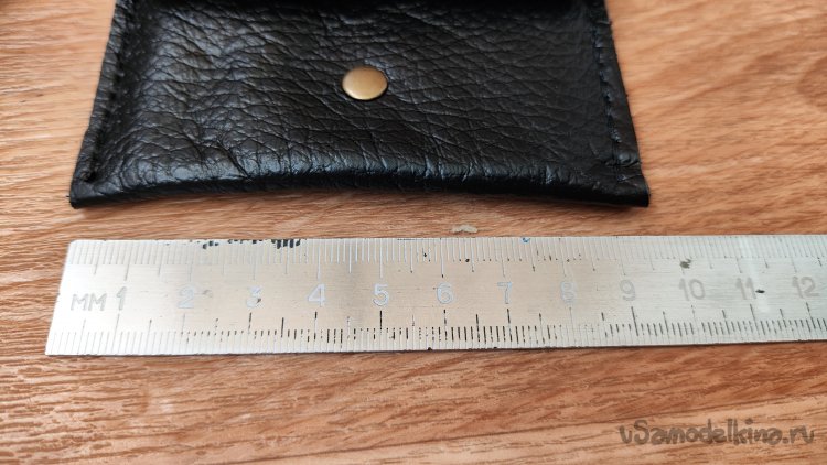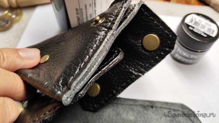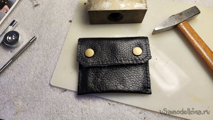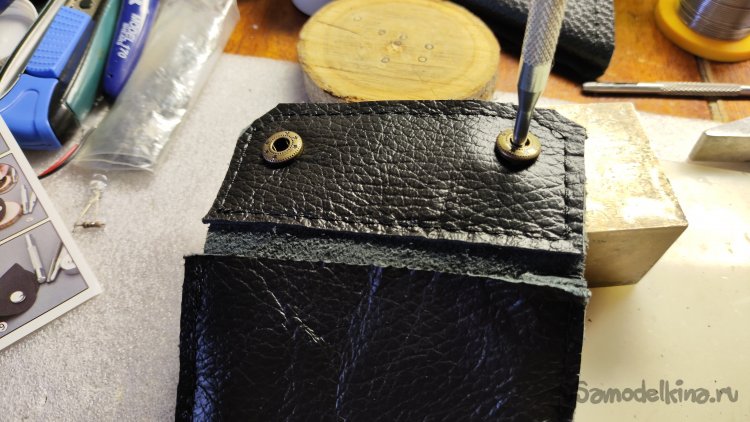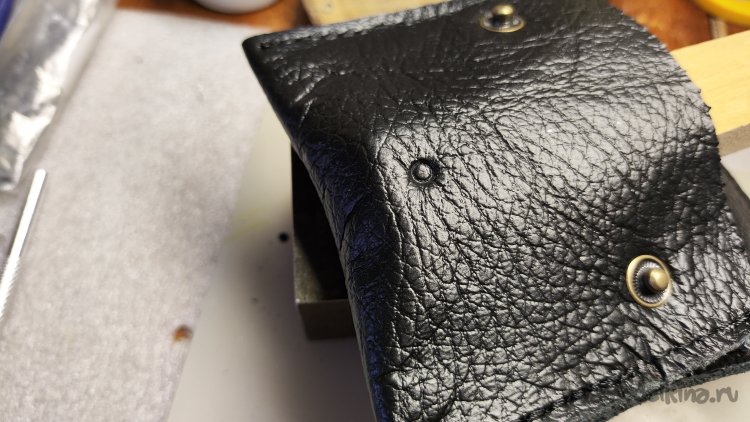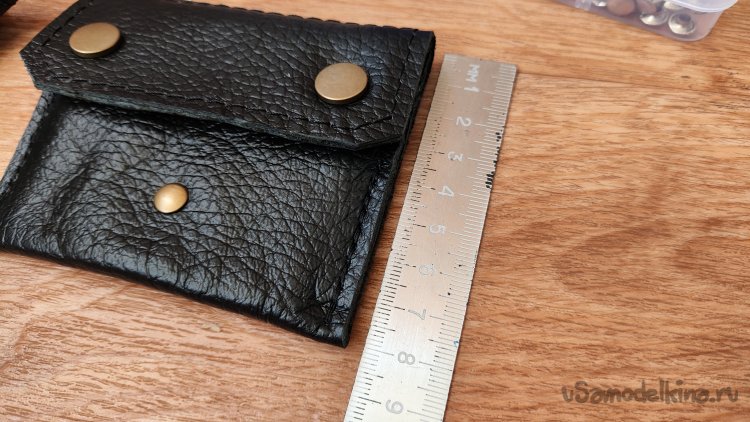 Кожа есть, осталось придумать, что из нее сделать. На просторах интернета нашел интересную треугольную модель монетницы. Вырезать её из полосы кожи не составило труда. Отрезал обычным канцелярским ножом, края закруглял ножницами. По краю прошил нитками. На одной модели решил не останавливаться и сделать обычную квадратную монетницу с клапаном. Замок применять не стал, хочу поставить кнопки. Заодно купил заклёпки или как их ещё называют хольнитены.