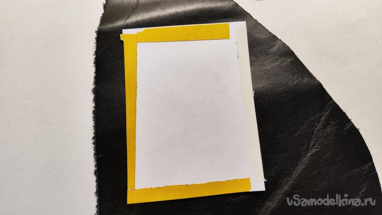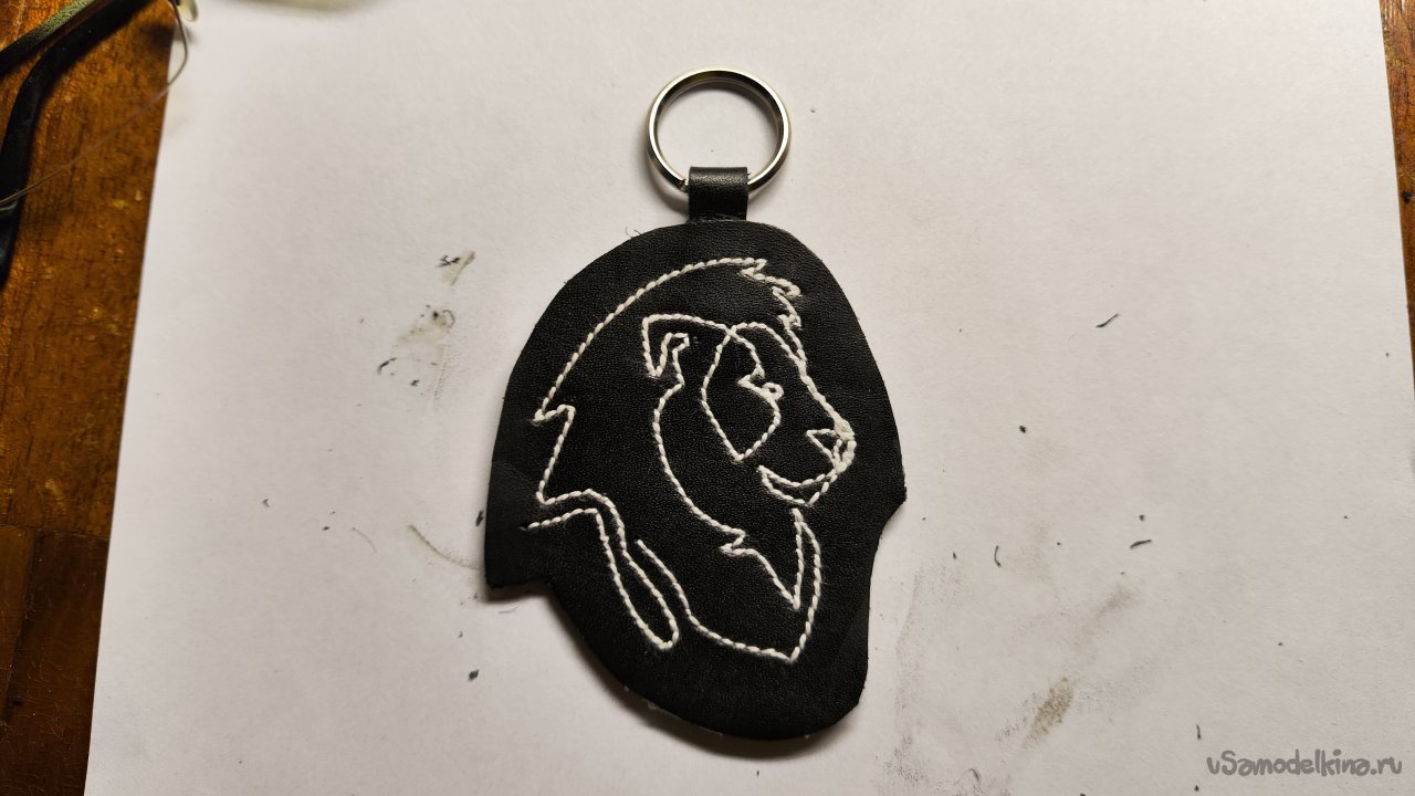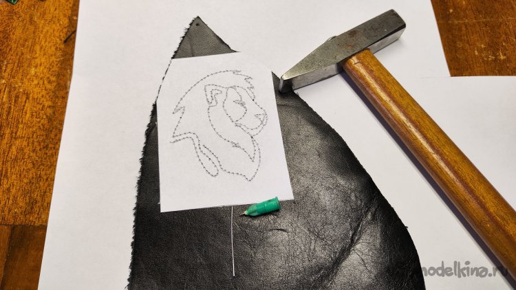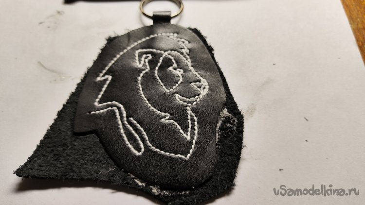 Второй брелок я делал по другому. Рисунок закрепил на коже степлером на скобы. Первоначально закрепил верхом головы к краю кожи, но потом решил, а пускай брелок будет из целоко куска и петельку под кольцо можно сделать цельной с основной частью, чтобы не было, как в первом варианте.