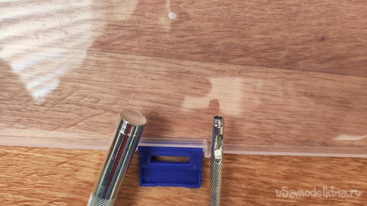 Подложил брусок, пробую пробить ответстие пробойником из комплекта. И нифига не получилось пробить отверстие тупым инструментом.