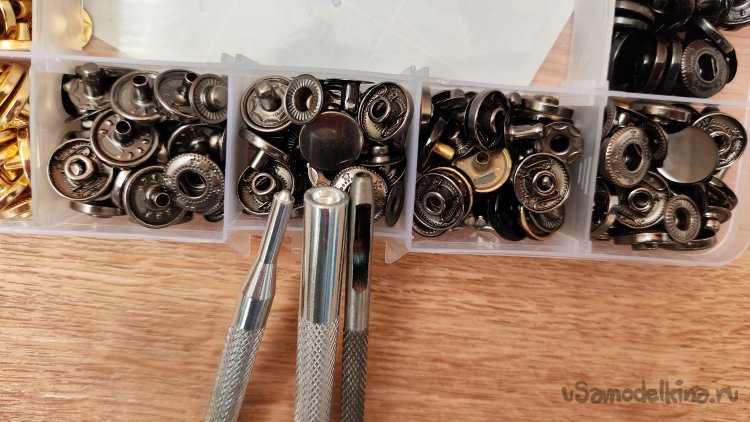 А это кнопки. Тоже с набором инструмента для установки. Пробойник здесь отличный, острый. Материал его другой, видно были претензии покупателей и пробойник заменили.