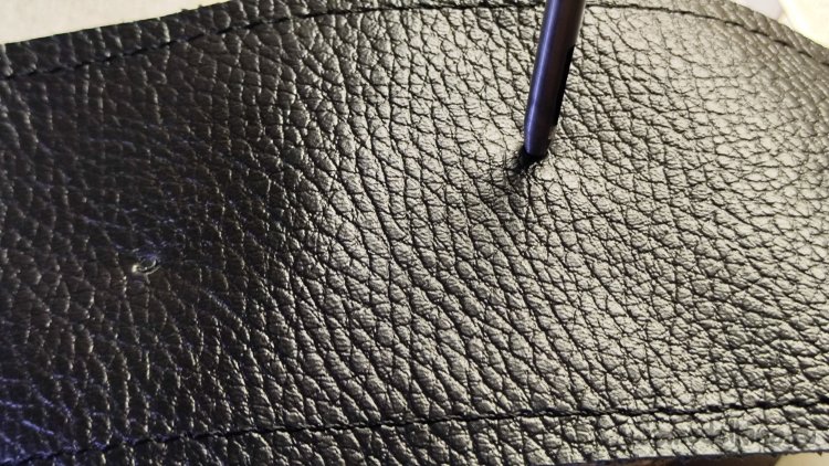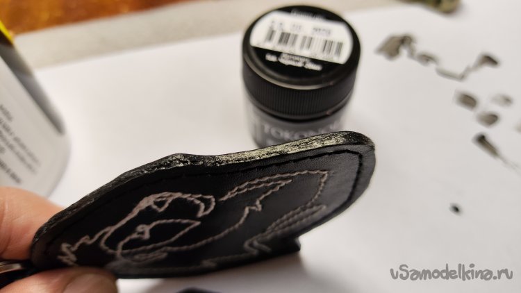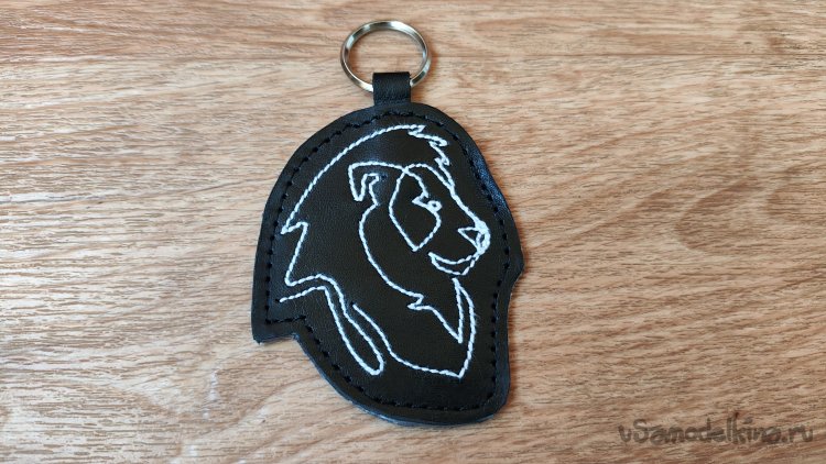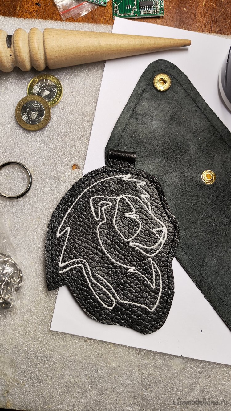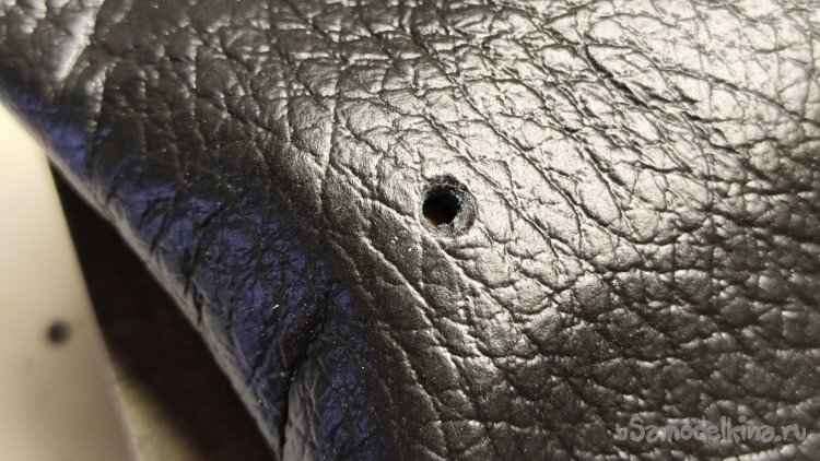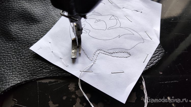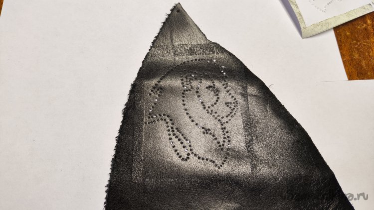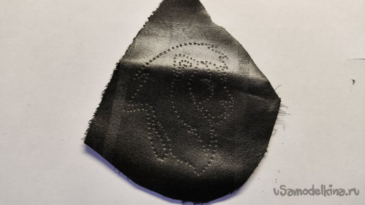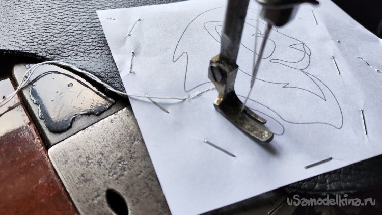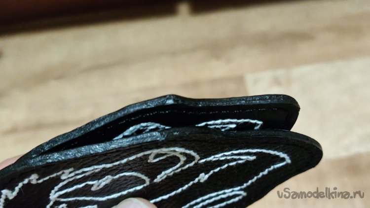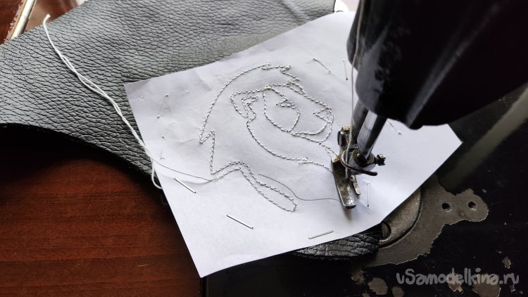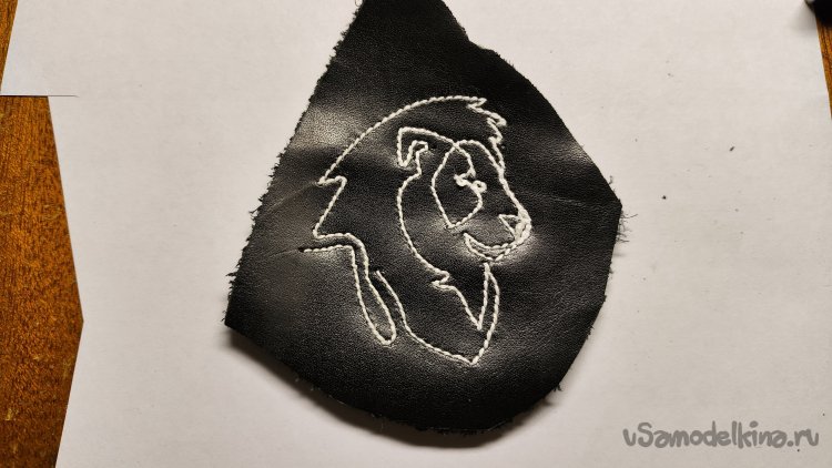 Во время прошивки столкнулся с тем, что черные отверстия на черной коже плохо видны, даже фонарик не сильно помог. Но хуже всего было то, что в нужном месте лапка машинки закрывает рисунок и не всегда было видно куда шить дальше. Пришлось постоянно сверяться с рисунком. После прошивки нашел пару непрошитых мест. Одно дошил иголкой с ниткой.