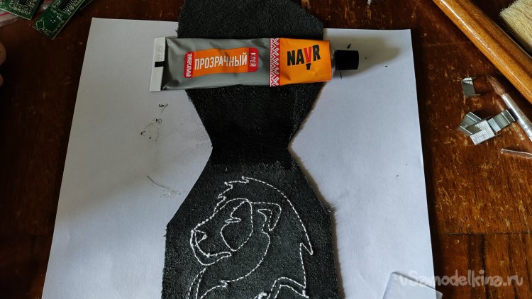 Потом намазал клеем всю оставшуюся поверхность. В том месте, где будет кольцо, вставил толстую проволоку, предварительно смазав ее ВД-шкой, чтобы не приклеилась. Подождал пару часов, обрезал лишнее ножницами, прошил по контуру черными нитками.