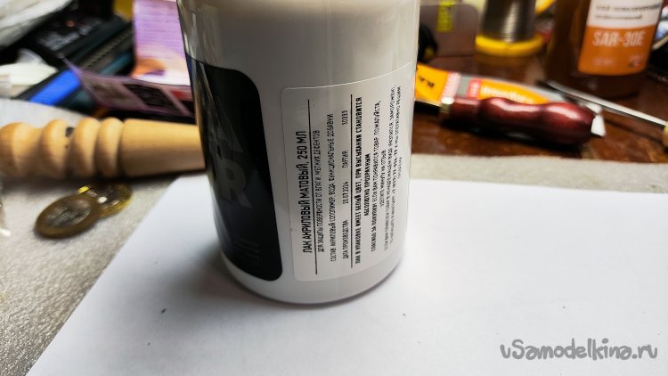 Для грунтования урезов купил акриловый матовый лак. Он белый, но после высыхания становится прозрачным.