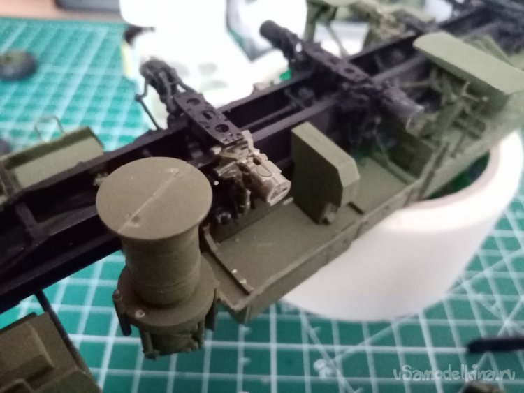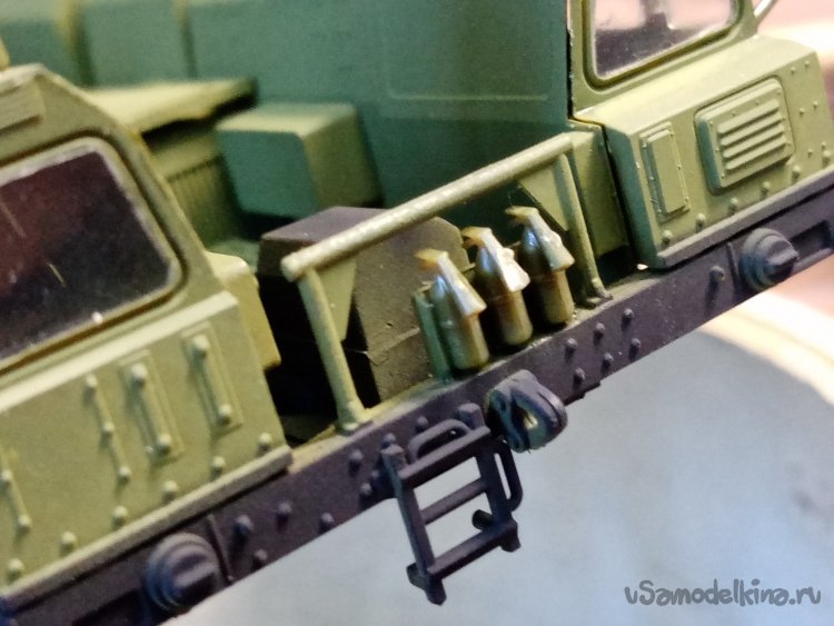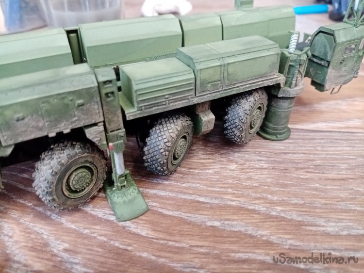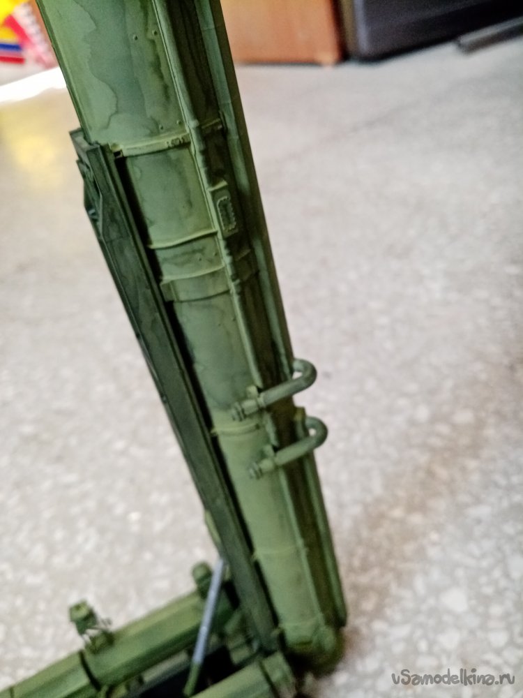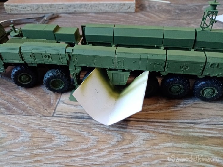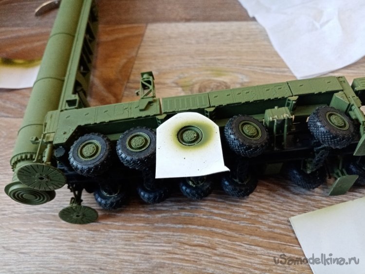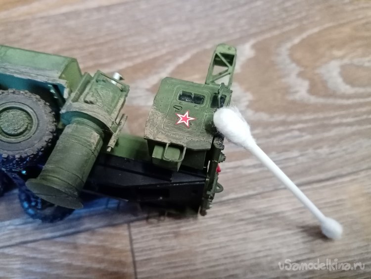 На конструкции изображаю потеки от дождей и прочих погодных неприятностей. Сам служил, видел, как краска на технике выцветает и идет полосами и пятнами. Получилось почти, похоже.