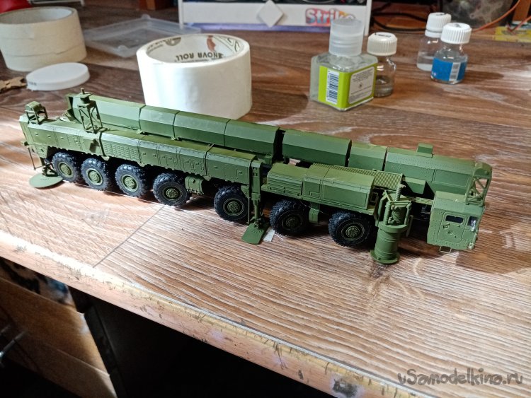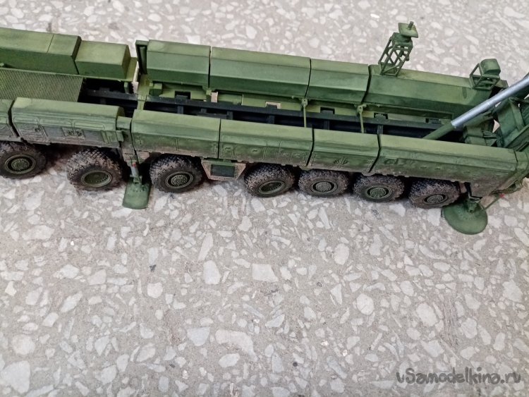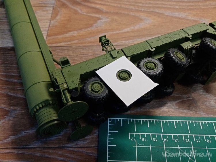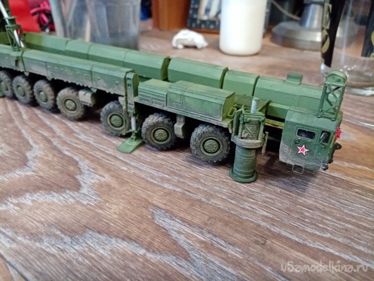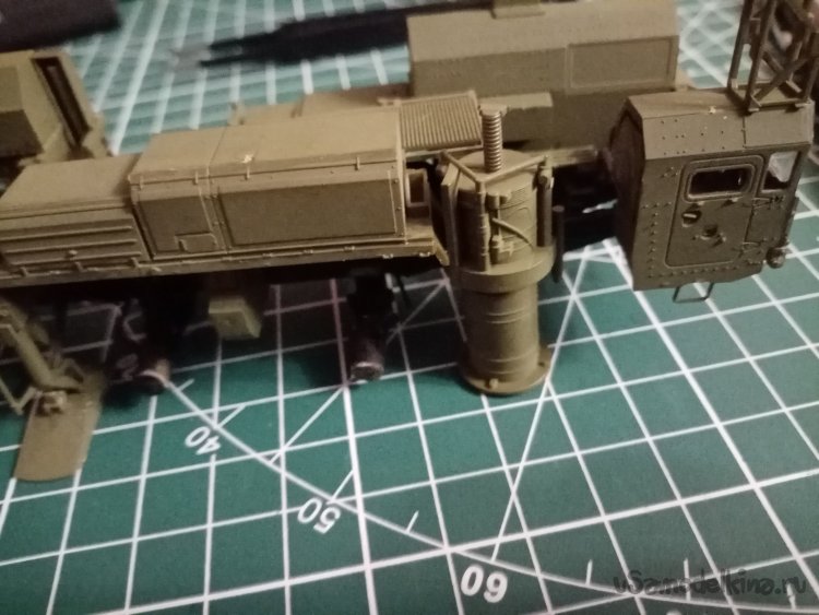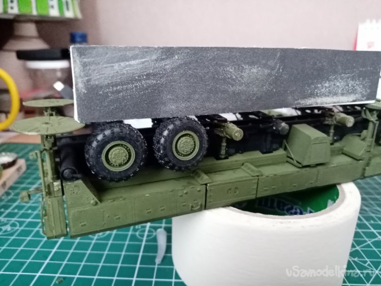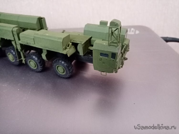 На конструкции изображаю потеки от дождей и прочих погодных неприятностей. Сам служил, видел, как краска на технике выцветает и идет полосами и пятнами. Получилось почти, похоже.