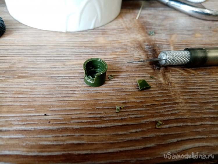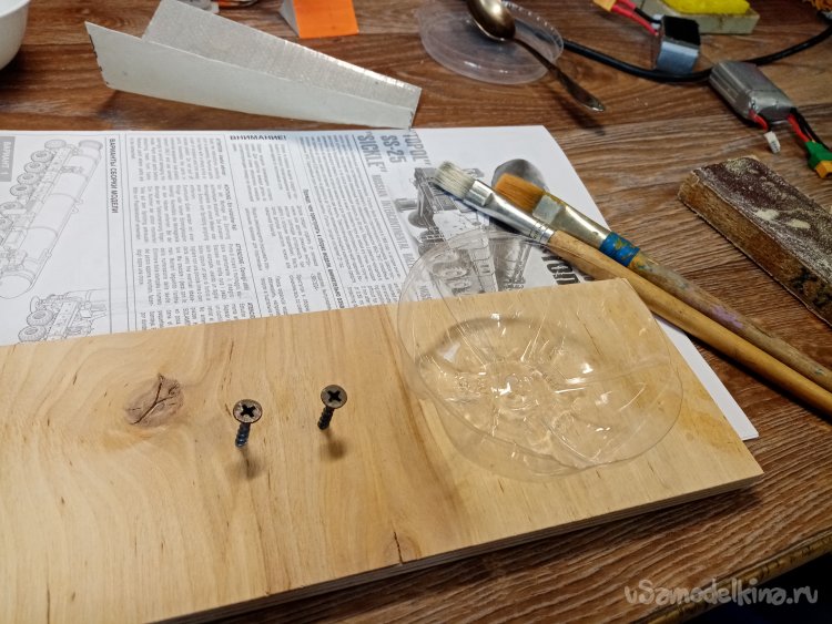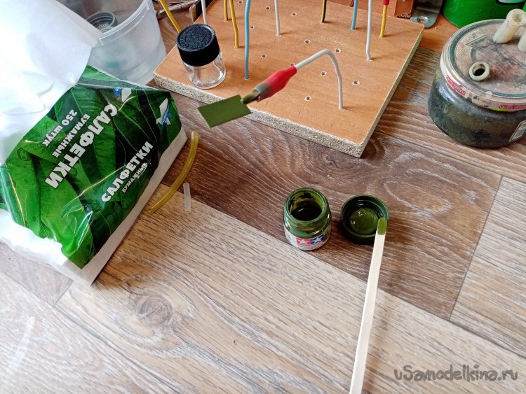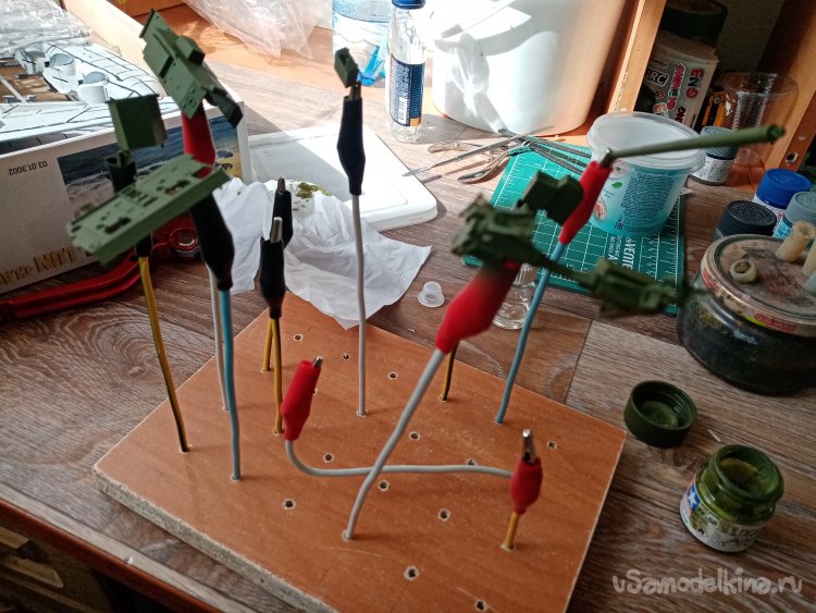 Открываю коробочку с краской. Вдыхаю знакомый запах краски ТАМИЯ. Затем отвлекаюсь от ароматов и окрашиваю детали полуматовой черной и зеленой краской. Мелкие детали закрепляю на самодельной плите с держателями крокодилами.