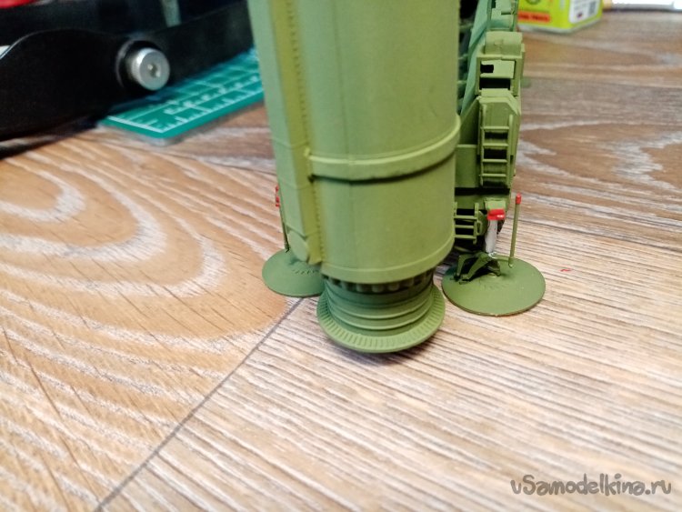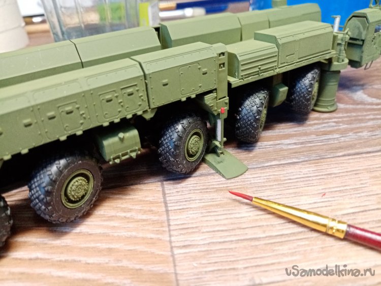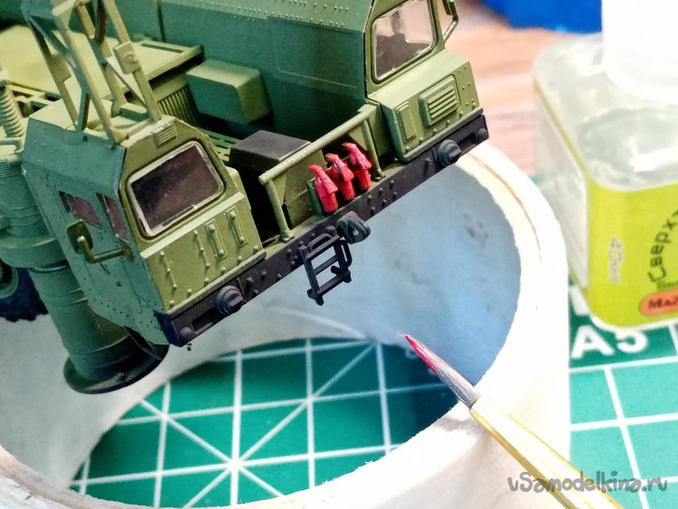 Закрепляю огнетушители. Интересно они будут нужны в реальной ситуации, или это чисто моральный элемент. Когда нидай бог все бахнет. Может они используют для тушения травы и леса после старта ракеты? Следом за огнетушителями окрашиваю некоторые детали красной эмалью при помощи кисточки.
