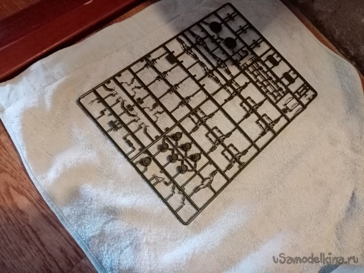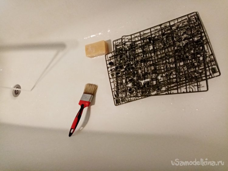 Отливки хорошего качества и есть подозрение на отличную стыковку деталей. Первое движение отмываю все компоненты в теплой воде с порошком. Осторожно орудую кисточкой, не отломить тонкие детали.