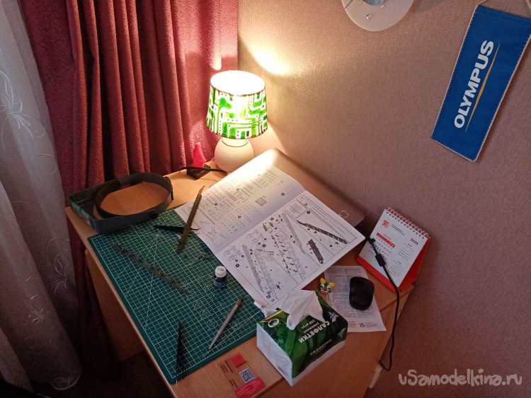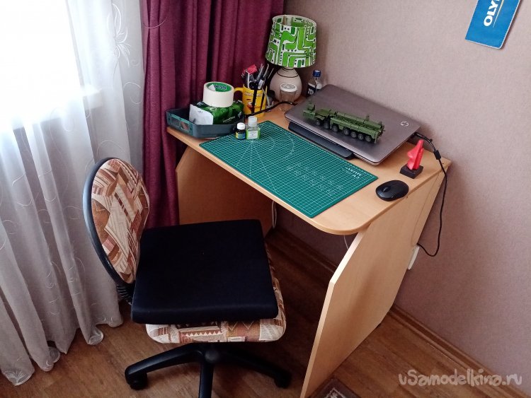 Мои рабочие места в моделке и дома. Собственно тут и проходит весь процесс. Но есть прикол, на темно зеленой поверхности мата защищающего стол, достаточно плохо видно темно зеленые детали. Это заметил еще давно, при изготовлении других моделей. Полез в интернет, нашел такого же размера но светло серого цвета. Заказал. Пришлют, заменю, и Вам рекомендую.