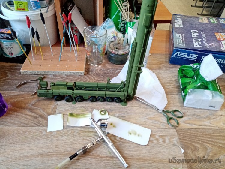 Крашу своим практически бесшумным компрессором, простым китайским аэрографом. Поскольку нет нужды в мелочах. Крашу по площадям. Эту процедуру провожу в моделке. Краску развожу по-разному. И фирменным растворителем и просто дешевой водкой. Поскольку процесс разведения нужно проводить непосредственно в аэрографе. Не нужно разводить в основной баночке, можно и ошибиться, и испортит большое количество весьма не дешевого материала. Водку покупаю в таких баночках с пластиковой крышкой, просто протыкаю иголкой и шприцем набираю нужное количество.