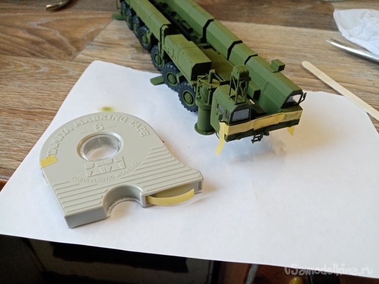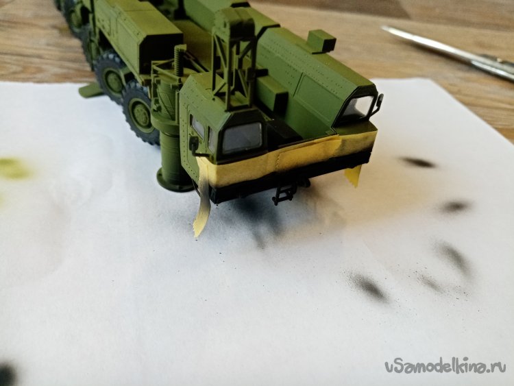 После всех строганий немного повредилась краска на колесных дисках и некоторых элементах. Вырезаю маску на колесиках. И задуваю повреждения по новой. Некоторые элементы защищаю экранами бумаги от оверспрея.