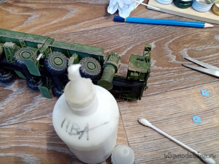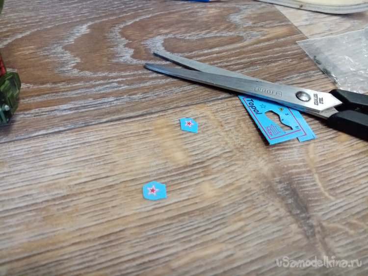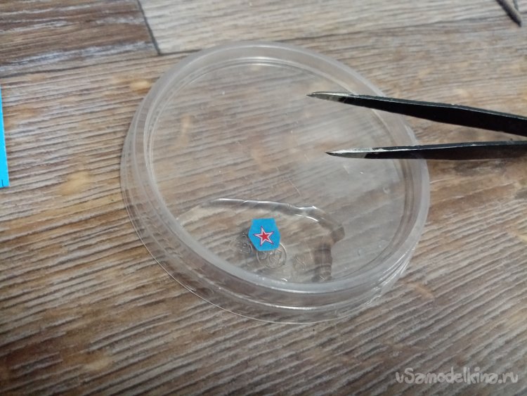 В пылу работы не нанес декали. Исправляю недочет. Немного мажу разбавленного ПВА на места нанесения декалей и позиционирую звездочки.