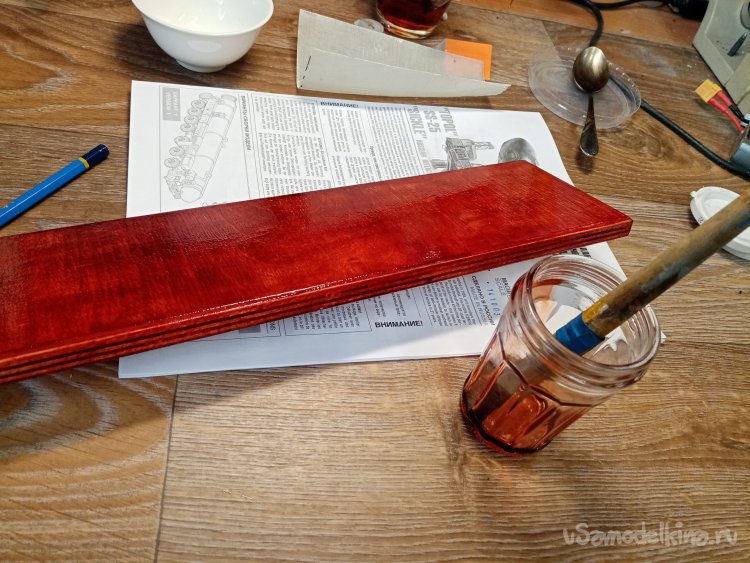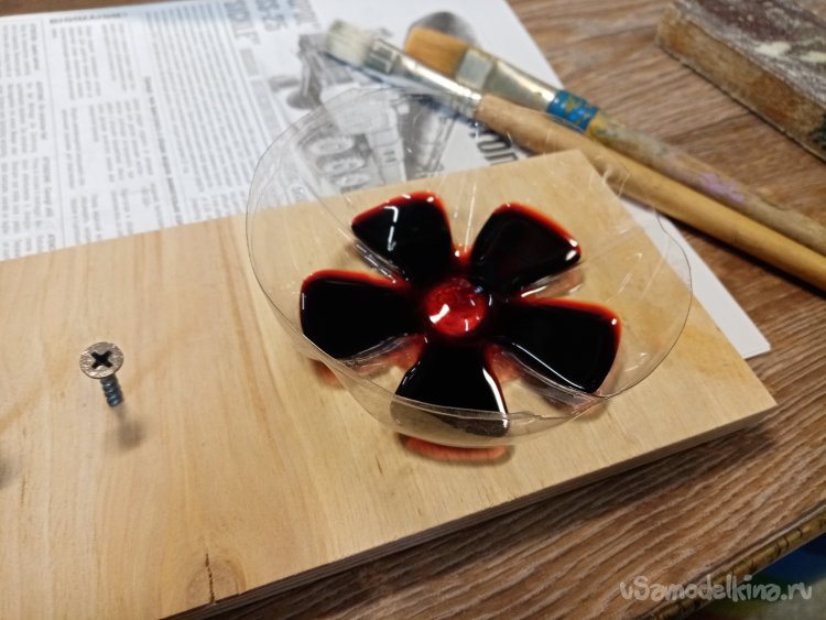 Декорирую морилкой и лаком. Поверх вырезаю еще одну пластину из белого рекламного пластика.