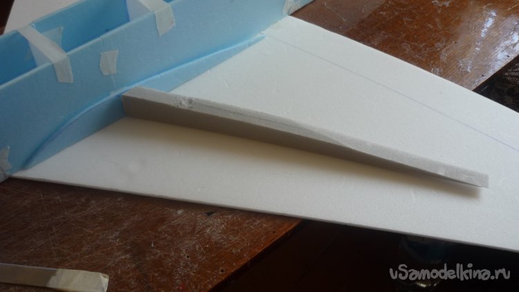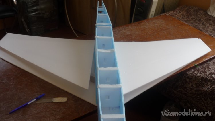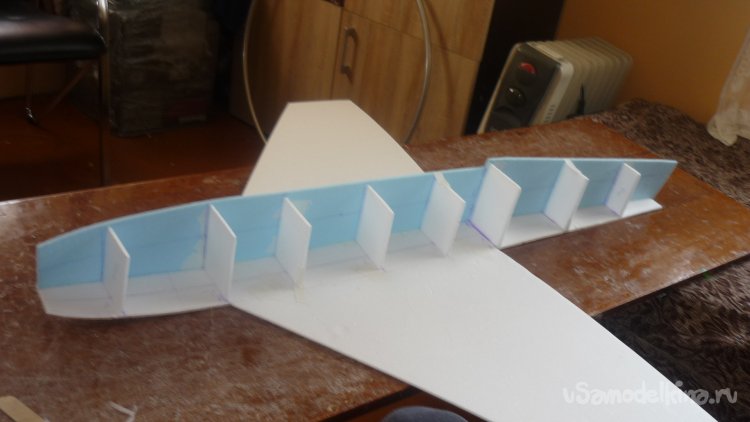 Вырезаю заготовки корневых нервюр , а из утеплителя делаю лонжероны. Все детали монтирую на нижнюю обшивку крыла.