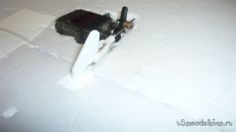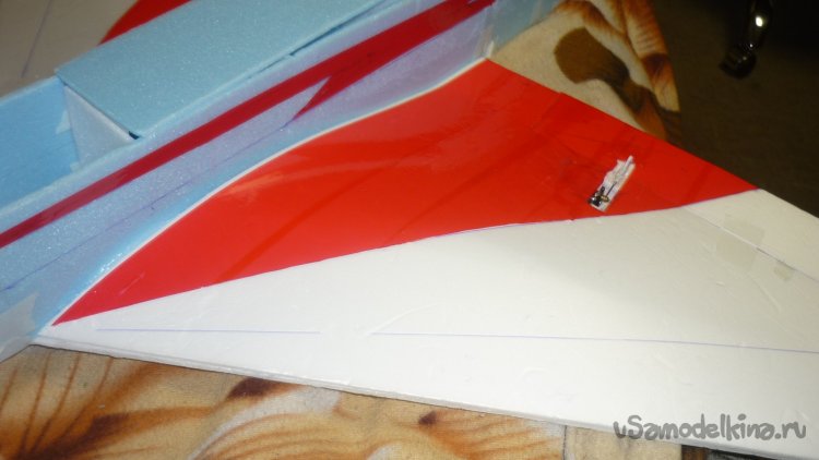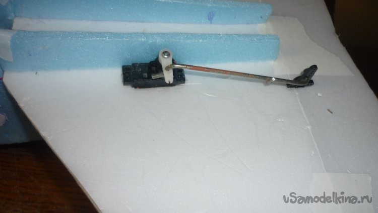 Разметил место установки сервомашинки управления рулём высоты и вклеил. Уклеил кабанчик и подсоединил тягу управления.