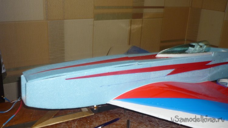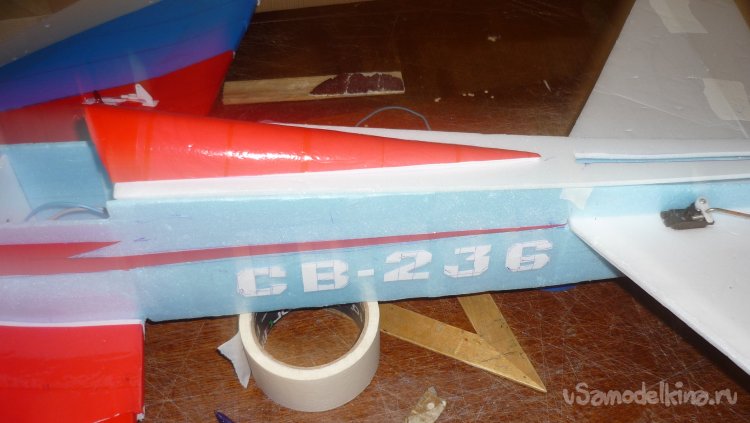 Обтягиваю цветным скотчем верхнюю обшивку фюзеляжа.