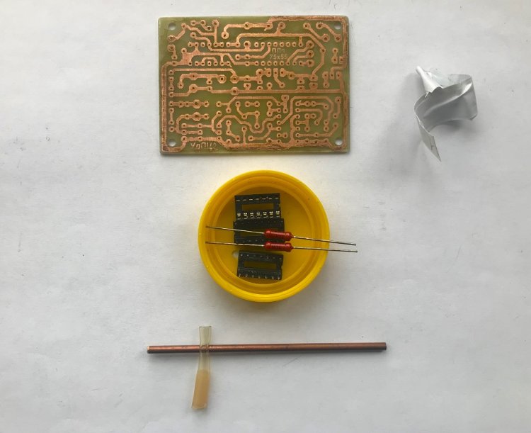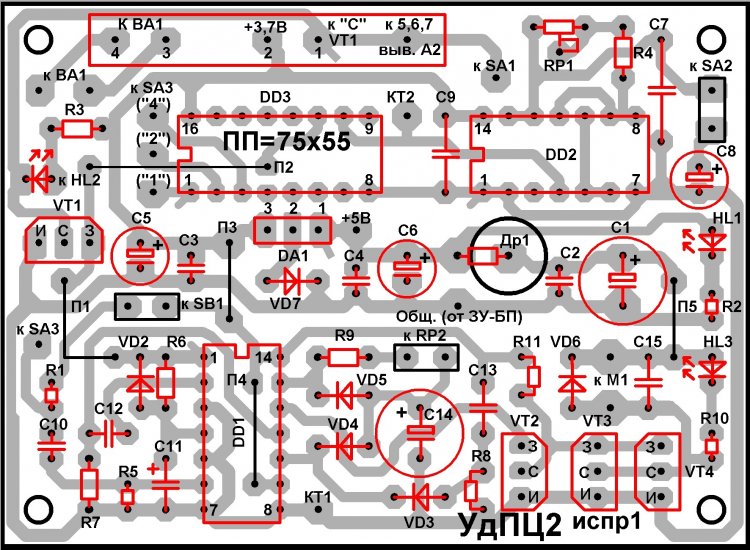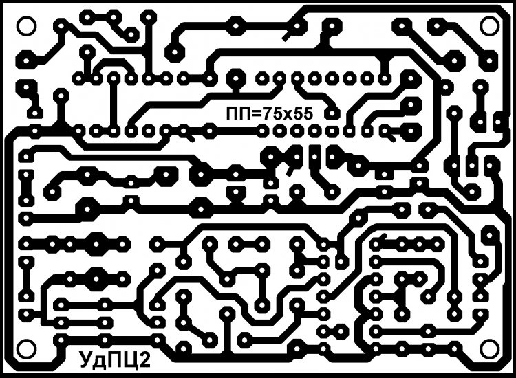 Основная ПП (печатная плата) (см. рисунки 02 и 03) выполнена из односторонне фольгированного стеклотекстолита размерами 75 х 55 х 2 мм. Диаметр отверстий на плате под микросхемы 0,7 … 0,8 мм, под радиоэлектронные компоненты – 0,8 … 0,9 мм, под соединительные проводники - 1…1,2 мм., под крепёжные винты – 3,0 … 3,2 мм.