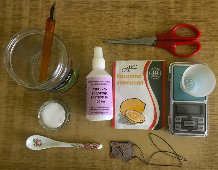 Химикаты для травящего раствора. При комнатной температуре в 100 мл 3%-ной перекиси водорода растворяют 30 грамм кислоты лимонной. После растворения добавляют 3 чайных ложки NaCl (поваренной соли).
