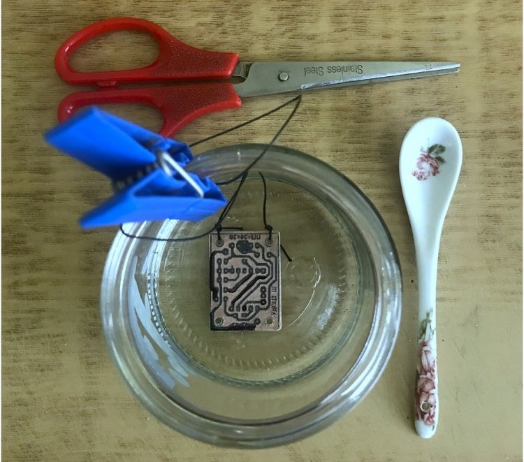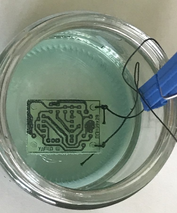 К травящейся плате привязывается суровая нить, чтобы не пачкая рук, можно было оперативно перемещать или вынимать плату. Нить (чтобы не упала в раствор) прикреплена к стенке банки бельевой прищепкой.