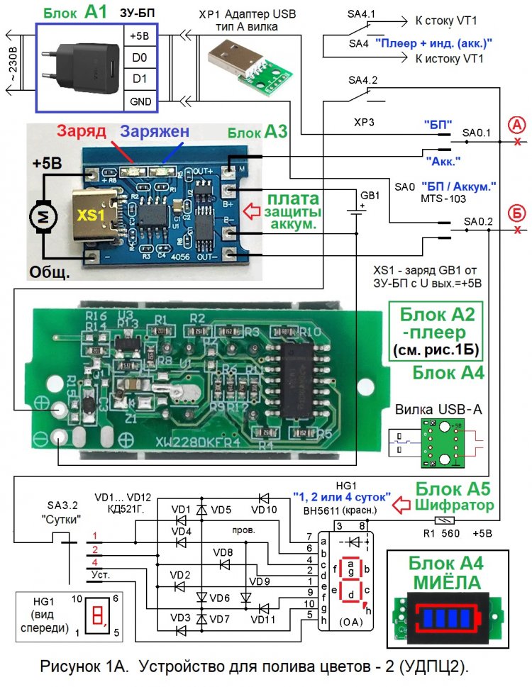 УДПЦ2 состоит из 4 готовых блоков (см. рисунок 1А). Самостоятельно изготавливаются собственно «поливатор» и Шифратор.