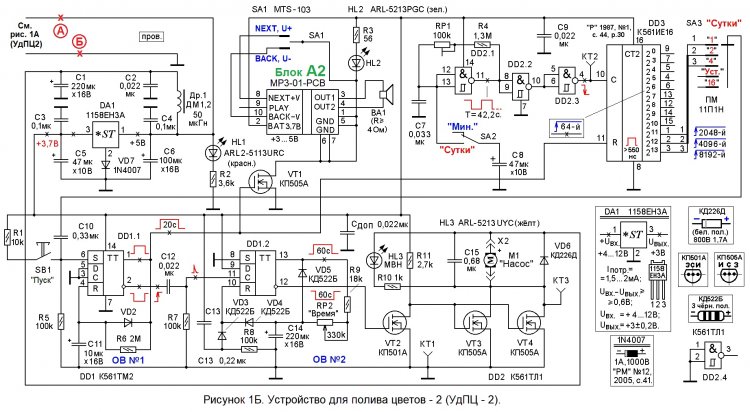 3). При использовании некоторых типов погружных насосов ёмкость конденсатора С15 рекомендуется увеличить до 470 мкФ, а в разрыв цепи «+» питания мотора-насоса М1 включить дроссель ДМ0,4 … ДМ0,6 индуктивностью от 16 до 224 микрогенри. При этом время работы ОВ №2 будет более стабильным.