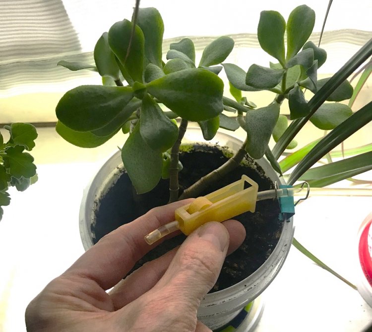 2). Чтобы вода после автоматического сеанса полива не продолжала медленно (но неуклонно) подтекать в цветочные горшки, бутыли с водой следует установить ниже подоконника, на который установлены цветы. Для установки бутыли подойдёт, например, табурет. Тогда эффект сообщающихся сосудов (возможно, объединённый с эффектом капельного полива) не будет действовать, и утечка воды из бутылей прекратится.